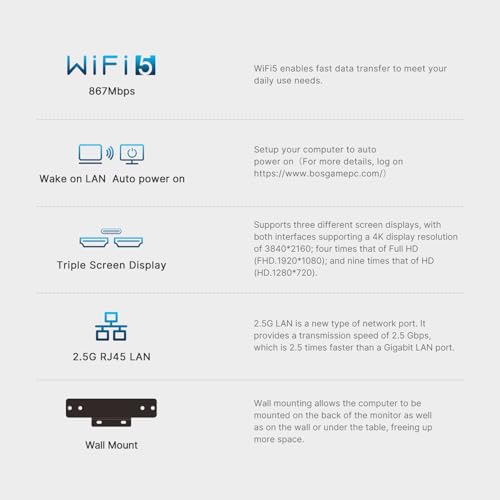 - 【WiFi 5 & Bluetooth 5.0】BOSGAME micro computer pc comes with Gigabit Ethernet supports, 2.4G+5.0G dual band WiFi 5 and Bluetooth 5.0. 2xHDMI+TypeC/4xUSB 3.2. It can work with server, monitoring equipment, office equipment, monitor, projector, TV and so on