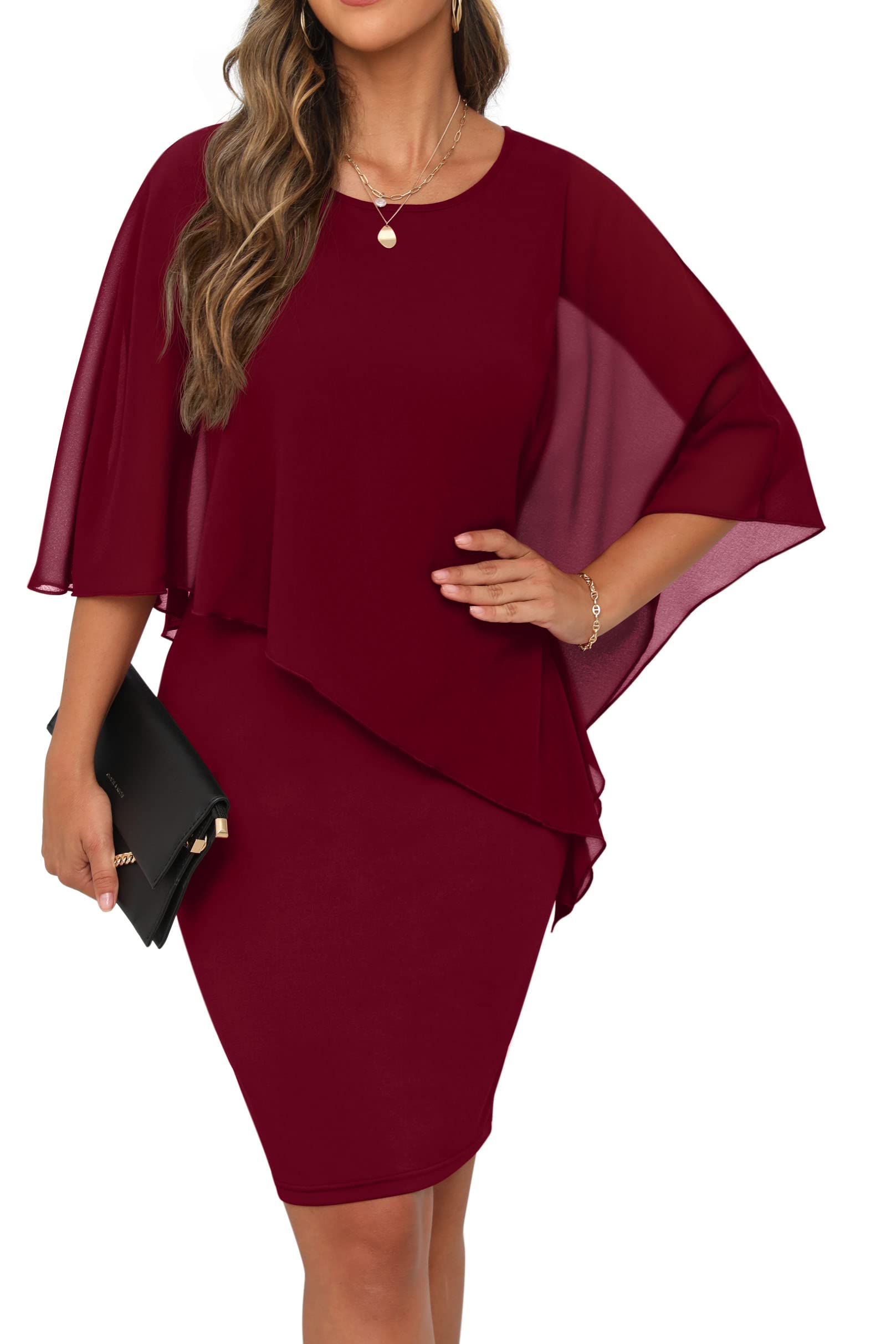 QIXING Womens Summer Casual Dress Loose Batwing Sleeve Crew Neck Chiffon Cape Elegant Midi Cocktail Pencil Dresses for Women UK for Funeral Party Wedding (Wine Red, M)
